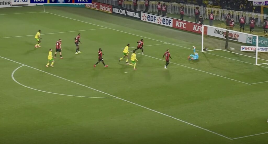 Dans la foulée, Nice fait preuve d’un réalisme froid. Sur un excellent centre de Jonathan Clauss, Diop surgit à bout portant et conclut du pied droit pour ouvrir le score (25’, 0-1). Un coup dur pour des Nantais pourtant entreprenants.