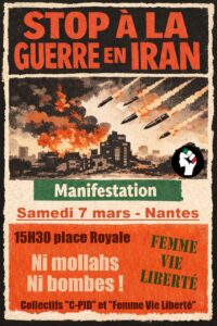 Le collectif C-PID et le collectif Femmes, Vie, Liberté de Nantes appellent les citoyennes et citoyens, les organisations démocratiques, les associations et les défenseurs des droits humains à se rassembler afin d’exprimer leur solidarité avec le peuple iranien et de dénoncer l’offensive américaine et israélienne contre les peuples iraniens.